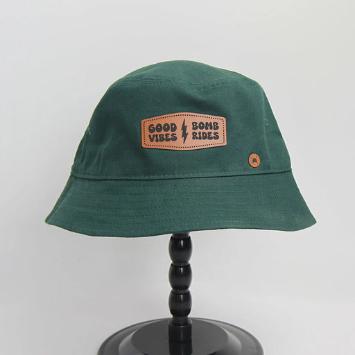 Good Vibes = Bomb Rides. 100% Cotton 90's style bucket hat with chestnut leatherette patch. Patches designed, made and hand-pressed in Los Angeles.